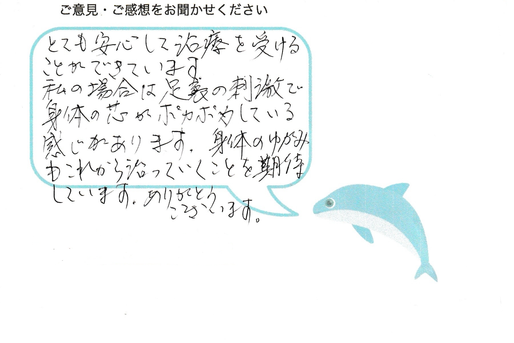 とても安心して治療を受けることができています。私の場合は、足裏の刺激で身体の芯がポカポカしている感じがあります。身体の歪みもこれから治っていくことを期待しています。ありがとうございます。